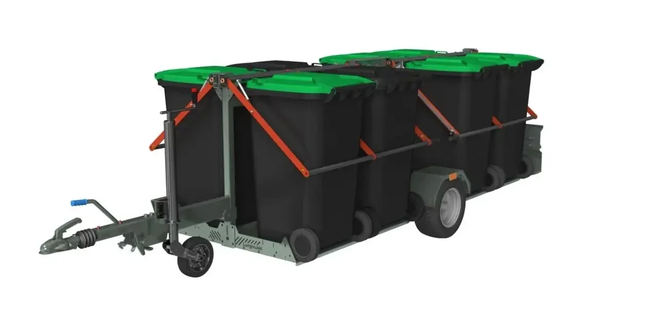 Mit dem BIN BEE 1.8 können bis zu 8 Müllbehälter nach DIN EN 840 je 120 l auf einem Anhänger sicher transportieren werden. Der Anhänger überzeugt vor allem durch seine extrem niedrige Ladekante, die sichere Verriegelung und die hochwertige Verarbeitung.